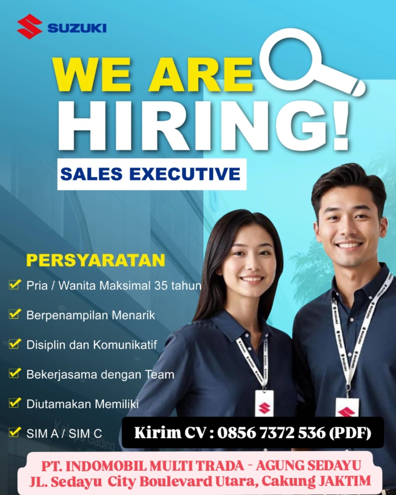 Suzuki Indomobil Agung Sedayu City adalah bagian dari jaringan dealer Suzuki terkemuka di Indonesia. Kami berkomitmen untuk memberikan pelayanan terbaik dan solusi otomotif yang inovatif kepada pelanggan kami. Saat ini, kami membuka kesempatan bagi Anda yang bersemangat dan berdedikasi untuk bergabung dengan tim kami sebagai Sales Executive.